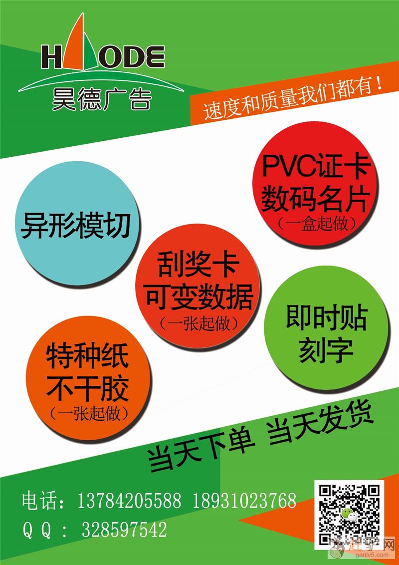 昊德广告是一家集设计、制作、安装为一体的全方面服务广告设计公司,您有想法,我们来实现!让您用最合适的价格拥有最好的质量!我们承接广告设计、异形模切、图文画册、展会布置、不干胶无版印刷、可变数据(可变二维码、流水号、条码、可变任意形状),一张起做立等可取!当天下单,当天发货,速度和质量我们都有!来源www.ganlv5.com